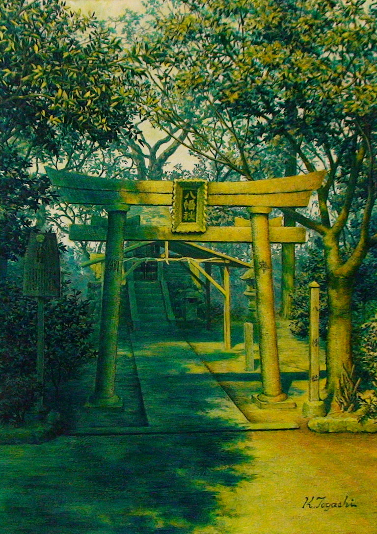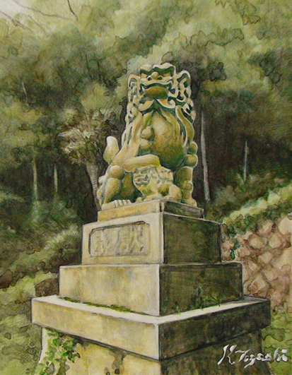 2年ほど前にこの狛犬を透明水彩で描きました。サイズはF0の小品ですが、なかなか気に入っています。この狛犬の良さを少しは引き出す事が出来たかな…と思っています。